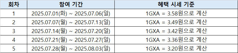 혜택으로 지급하는 갤럭시아(GXA) 시세 기준은 회차별 다르게 적용됩니다.8