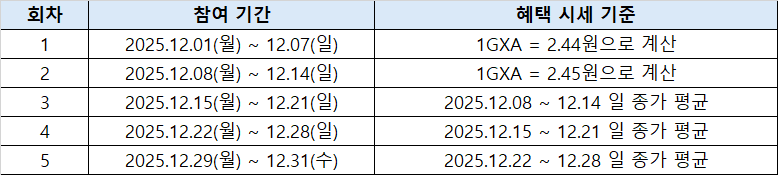혜택으로 지급하는 갤럭시아(GXA) 시세 기준은 회차별 다르게 적용됩니다.