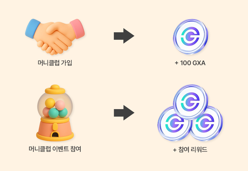 머니클럽이 차별화되는 점은 디지털자산 '갤럭시아(GXA)'를 주요한 리워드로 제공한다는 것입니다. 머니클럽에 가입한 모든 회원은 웰컴 리워드로 100 GXA를 받게 되며, ‘GXA 머니또’ 등 리워드 프로그램 및 이벤트 참여를 통해 더 많은 갤럭시아(GXA)를 획득할 수 있습니다. 머니트리카드 충전·결제 실적이 높을수록 당첨 확률이 올라가거나 리워드 규모가 커지는 등 차등적인 혜택이 적용됩니다.
