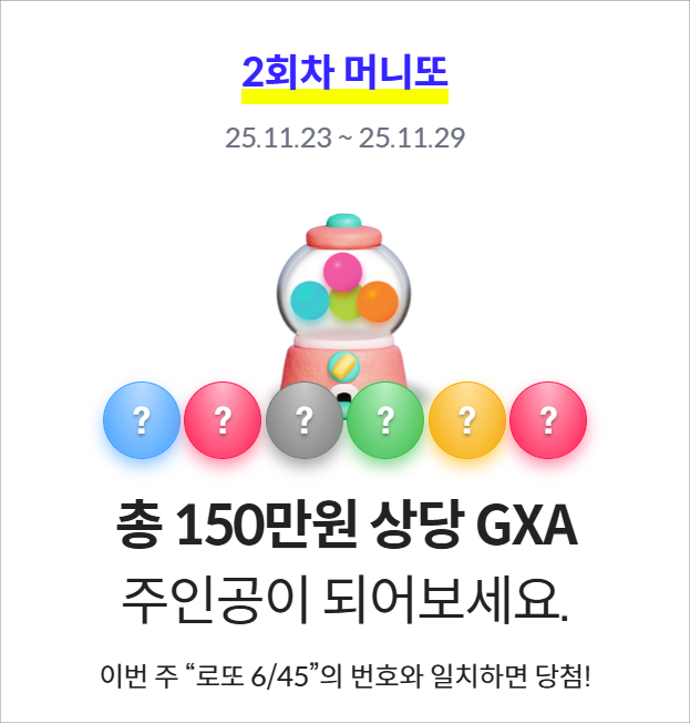 GXA 머니또는 머니클럽에서 첫 번째로 선보이는 리워드 프로그램입니다. 매주 1회차씩 상시 진행되며, 머니클럽 방문, 머니트리카드 충전 및 결제 등 회차별 정해진 미션을 수행하면 응모권을 획득할 수 있습니다. 응모권으로 응모한 번호가 '로또 6/45' 당첨 번호와 일치하면 등수에 따라 차등적으로 갤럭시아(GXA)를 받게 됩니다.